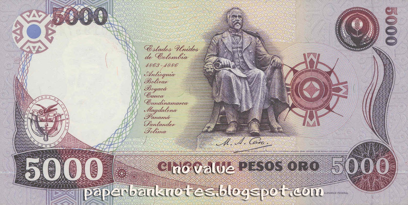 This commemorative note was issued in 1986 to celebrate the country's 100th Year of its Constitution 1886-1986. The front of the note depicts the country formal President Rafael Nunez (1879-1882 and 1884-1894). President Rafael Nunez was born in 1825 and died in office in 1894. The Constitution of Colombia 1886 created the Republic of Colombia from the United States of Colombia. The 1886's Constitution basically changed how the country is governed, how the President is elected and for how long and the power of the Presidential in appointing officials to public offices. This Constitution has since been replaced by the Constitution of 1991. On the back, it depicts Miguel Antonio Caro, who was the Vice President of Colombia (b. 1845-1909). This note is printed by Bundesdruckerei Alemania Federal in Berlin Germany. Subsequent notes printed (P435, P436 and P436A) by various printers are not considered as Commemorative issues.